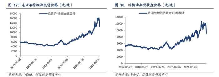 信达证券数据显示,印度尼西亚与马来西亚是全球最主要的两大棕榈油出口国,两国合计棕榈油出口总额可占全球近90%。但由于新冠疫情的扰动,以及不利天气的影响,两国的棕榈油产量不及预期,印尼限制棕榈油出口,而中国又是棕榈油消费大国,供需失衡下带来了较长一段时间的棕榈油价格上涨。