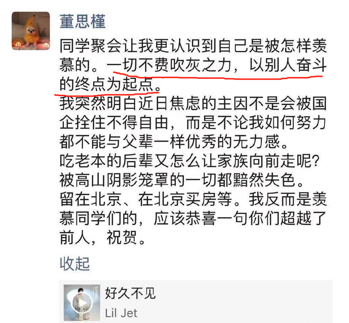 事发前,董小姐在朋友圈说:一切不费吹灰之力,以别人奋斗的终点为起点。