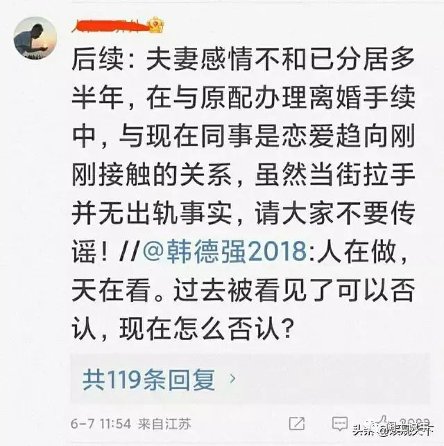 据知情人士讲,胡总和原配感情不和,已经分居多年,目前办理离婚进行中,并无出轨事实。女下属也并非“小三”,两个人是大大方方的朋友关系,趋向进一步的发展。