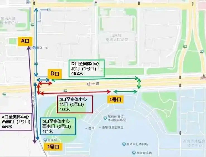 路线2:奥体中心站D口出站,沿经十路辅路向西到奥体西路与经十路交叉口后,左转向南到达奥体中心西南门(2号口),步行约474米。