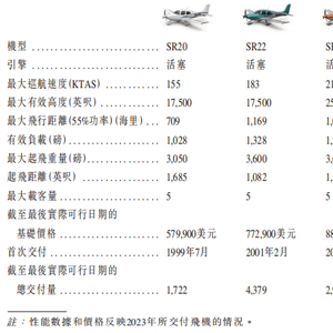 (1)SR2X系列,主要供零售客户使用的单引擎活塞飞机,包括SR20、SR22及SR22T三大机型,具备机队及特殊任务应用的专用配置;