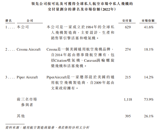 于2022年,活塞及涡轮飞机等私人飞机的三大市场参与者的交付量合共为1,118架,其中,公司交付的比例为41.6%。