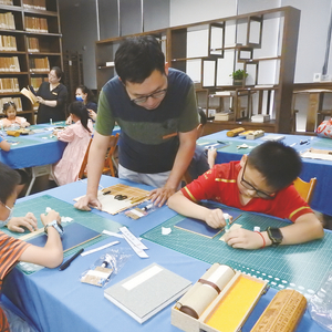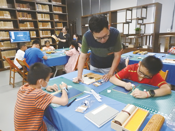 ▶广西博物馆里,小朋友们在文物修复师的指导下学习制作线装书