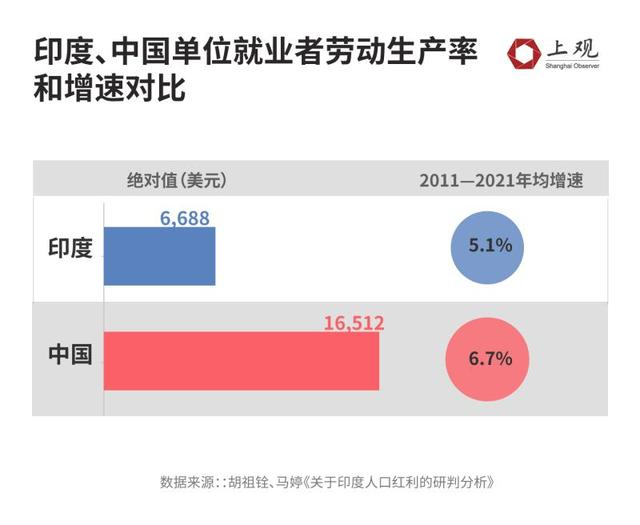 2021年印度单位就业者劳动生产率为6688美元,而中国的单位就业者劳动生产率为16512美元(以2010年不变价美元计价)。也就是说,中国每个就业劳动者能够生产的价值是印度的2.5倍。