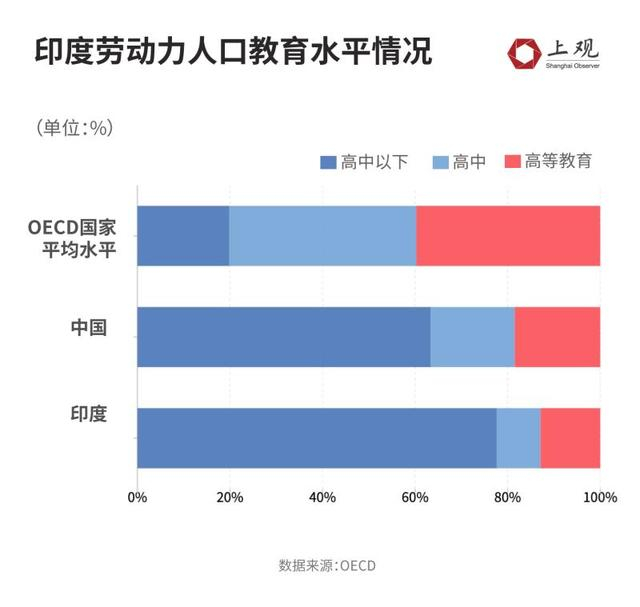 根据经合组织数据,印度劳动力人口中未完成高中教育的占比达到77.6%,大专和高等教育占比为12.9%,完成高中教育的比例最低,仅有9.4%。