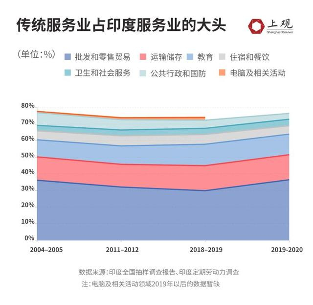 而我们经常听到的印度IT技术外包业务,其实在整体服务业的占比非常小,到2019年也只有1.7%,放在全部就业人口中微不足道。