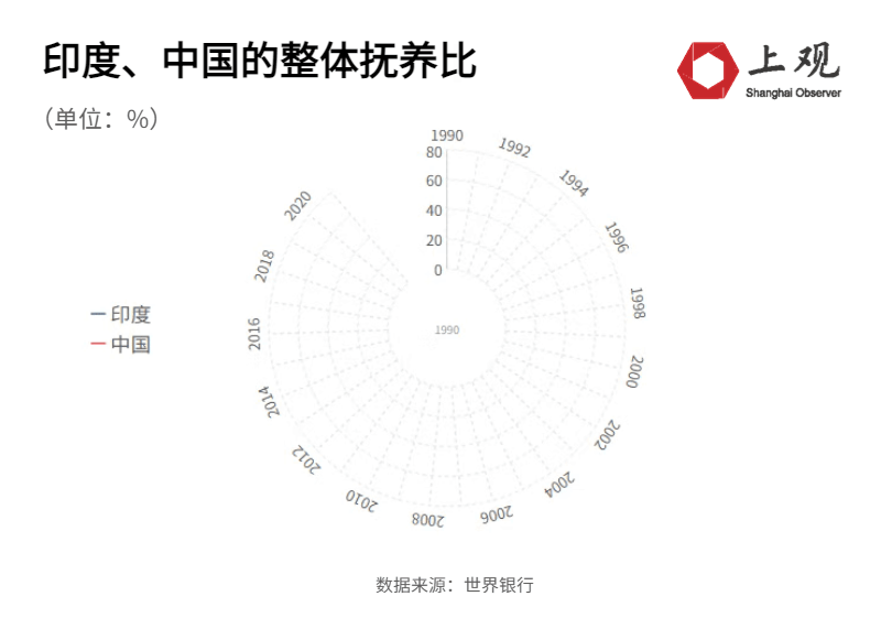 从2019年开始,印度总抚养比首次低于50%且不断下降,2021年数据显示为48.1%,其中老年抚养比达到10.1%,少儿抚养比则为38.1%。