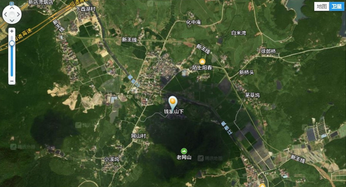 在卫星地图可以查到老网山、钱家山下及其周边村落。