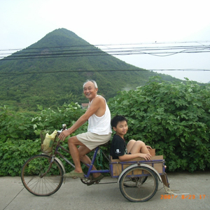 爷孙俩背景里的老网山(2007年夏,黄仕忠摄)