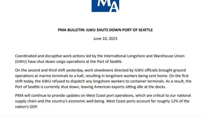 PMA表示:“在今天的第一个班次中,ILWU拒绝派遣任何沿岸工人前往集装箱码头,导致港口关闭。美国的出口货物目前被滞留在码头上。PMA将继续提供西海岸港口运营的更新,这对我们国家发供应链和经济福祉至关重要。西海岸港口贸易大约贡献了全美GDP的12%。”