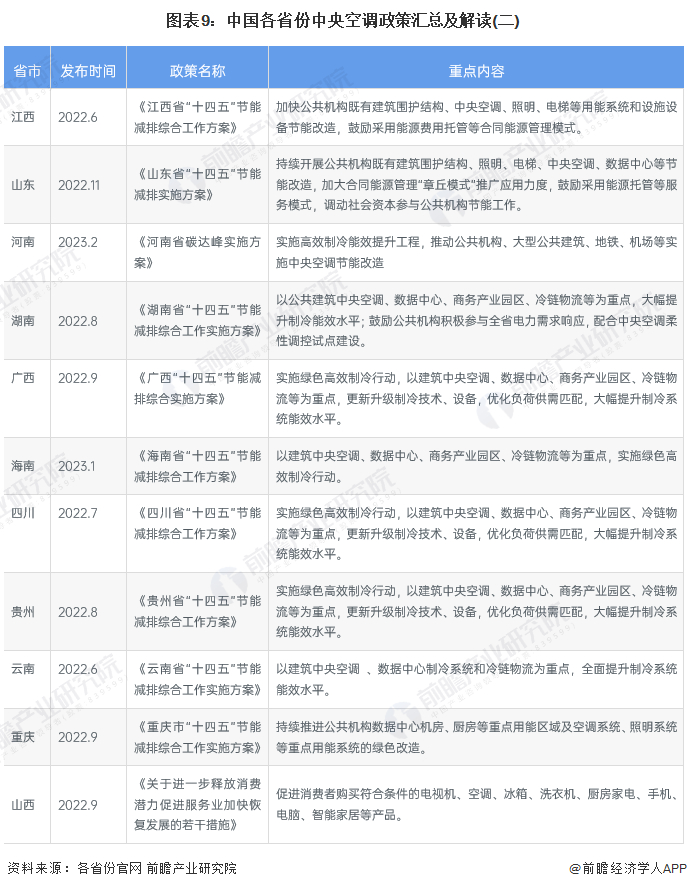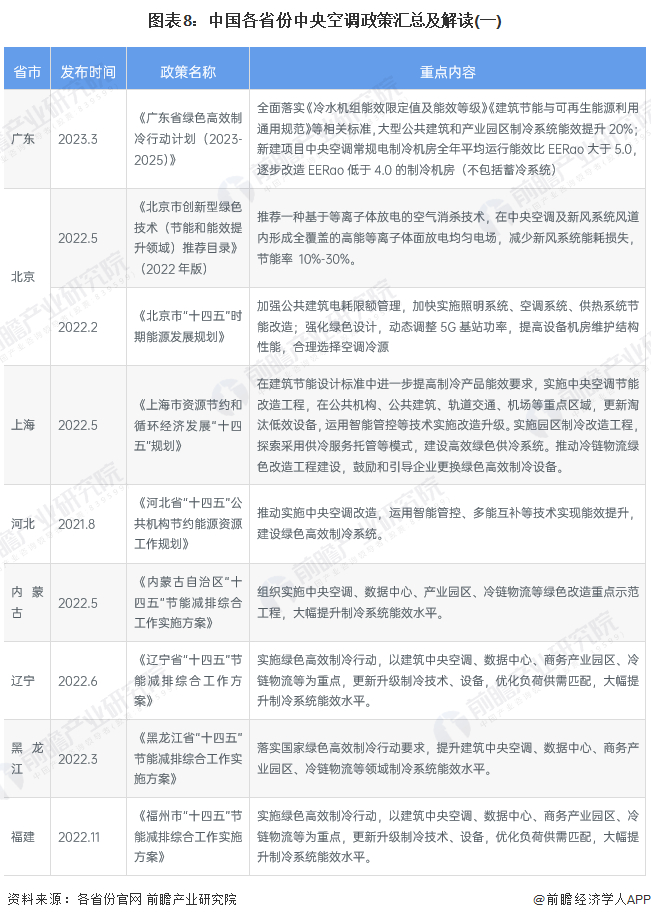 除了中共中央、国务院等部门颁布一系列政策外,各省市同样出台了一些举措来指导中央空调行业的发展。主要方向为提升制冷效率,引导中央空调行业绿色化发展。