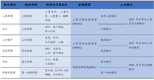 它们的显著特征,是背靠各自的财团,而财团内银行、综合商社与制造业企业交叉持股,即通过“股权换商权”来实现财团内各成员之间利益的绑定,形成“产商融”相结合的体制。在财团企业中,主办银行负责资金融通和集团内交易,为其他企业参与项目和开拓海外市场提供资金支持。