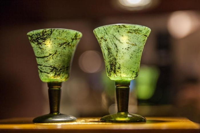 他是懂得“红妆宝镜珊瑚台,青琐银簧云母扇”的美学搭配的。酒泉的夜光杯配上凉州的葡萄酒,让人感受到明月出天山的皎洁,也让我们感受到长风几万里的豪迈。夜光杯的传说由来已久,据东方朔的《海内十洲记》中的《凤麟洲》记载:“周穆王时,西胡献昆吾割玉刀及夜光常满杯。刀长一尺,杯受三升。刀切玉如切泥,杯是白玉之精,光明夜照。”这里所说的割玉刀和夜光杯几乎是童话。其实,越是古远的东西实事上越是朴拙,在传说中也越神奇。可以肯定的是夜光杯最初是用和田白玉制作的,由于路途遥远,制作好的酒杯不易保护,后来人们就在酒泉一带就近取材,制作出了如今深绿色的玉杯。“夜光杯”这个名字最早应叫作“月光杯”,而后来在酒泉制作的应当叫“夜色杯”才对,浅绿色的朦胧和上那深绿色的斑点更是月中桂树的斑驳的树荫。