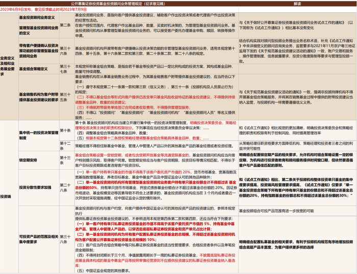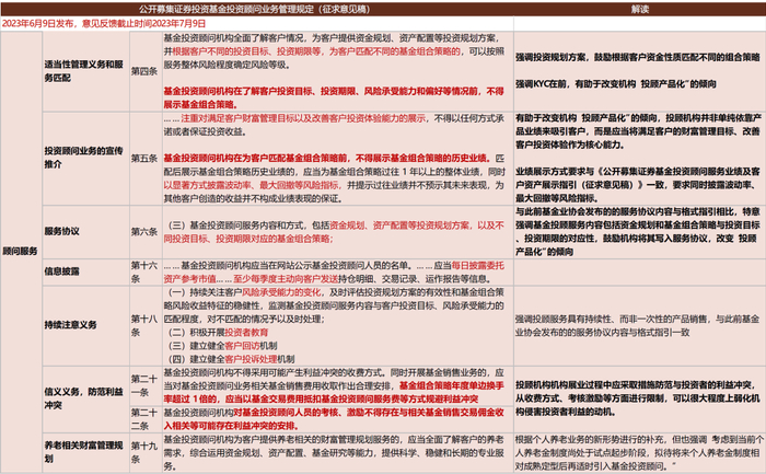 ► 投资端:1)《规定》加强了对投顾机构管理型投顾加总后的整体投资分散度的要求,“单一基金投资顾问机构所有管理型基金投资顾问业务客户持有单只基金份额合计不得超过该基金总份额的50%,持有单只货币市场基金、开放式债券基金份额合计不超过该基金总份额的20%”,而此前《试点工作通知》仅对单一组合策略层面的集中度提出要求,即“单一基金投资组合策略下所有客户持有单只基金的份额总和不得超过该基金总份额的20%,持有指数基金的份额总和不得超过该基金总份额的30%”。2)要求投顾机构建立集中统一的投资决策管理制度,明确投资决策委员会、策略经理等投资决策主体的职责与权限划分,有利于在整体风险可控的情况下提升投资管理决策效率,同时要求策略经理不得兼任除基金中基金、管理人中管理人产品以外的其他基金产品的投资经理,从人员资管要求方面降低机构、策略经理和投资者三者之间的利益冲突可能性。3)明确组合配置私募证券投资基金的相关要求,有利于投顾机构规范有序地增加投顾组合底层产品丰富度,充分利用自身业务优势,也为客户提供更多样的选择。《规定》增加私募基金组合监管要求,单一客户持有单只私募基金市值不得高于其委托资产的5%,单一投顾机构为所有客户配置的私募基金总规模不得超过公募基金的10%。4)明确在客户知悉及适当性管理的基础上,组合策略可以设置一定的锁定期或包含流通受限基金,一定程度上相当于放宽了底层投资产品范围,允许将定开基金等品种纳入策略组合中,同时也为投顾机构争取了进行投资者教育等顾问服务的窗口期。