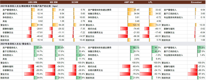 注:1)AMP、LPL代销金融产品业务基于资产规模的持续性部分计入销售交易收入,而MS、UBS、SCHW计入资产管理类收入;2)由于部分年份收入与支出细项披露不全,因此表格中部分年份细项相加不等于总和;3)非顾问费用支出包含非顾问员工的薪酬和福利;4)UBS财富管理部门2021年薪酬支出为估计值;5)其他收入中包含向非员工顾问提供各种展业支持获得的收入