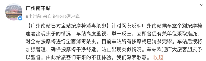 广州南站就“车站按摩椅出现虫子”致歉:已消杀完毕,将加强管理