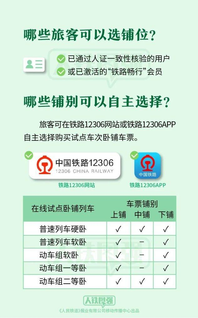 6月10日,国铁集团在12306网站(含手机客户端)试行在线选铺服务,选择通达全国各区域的230趟高铁、普速旅客列车作为试点,对普速列车软卧、硬卧和动车组软卧、一等卧、二等卧等铺别提供在线自主选铺服务,同时,继续实行对60岁以上老人等重点旅客优先分配下铺的服务。