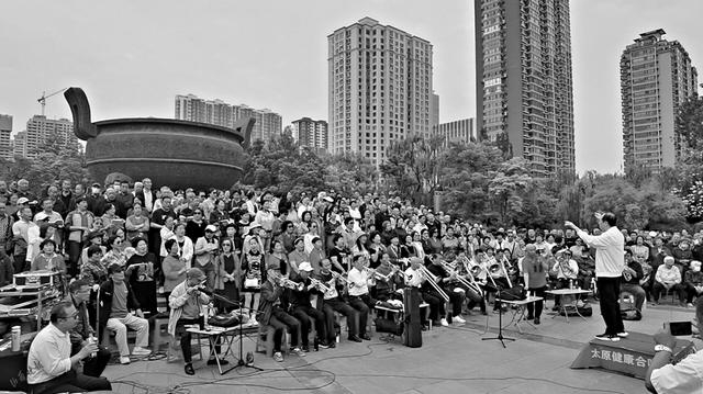 太原市龙潭公园龙潭广场的大鼎附近,每到周末或者节假日,一支超过1000人的合唱团在此放声高歌。合唱团是太原市鼓楼街办东仓巷社区健康合唱团,成立于2015年10月,多次荣获全国和省内的金奖银奖等多项荣誉。团长郭三宝介绍,他们是一支混声合唱团,目前有正式团员80余人,平均年龄在60岁上下,年龄最大的有80岁。而龙潭公园的上千人合唱团,是以他们这支合唱团为基础,很多周围热爱歌唱的群众、声乐器乐的老师等加入,一起在大鼎附近排练的。