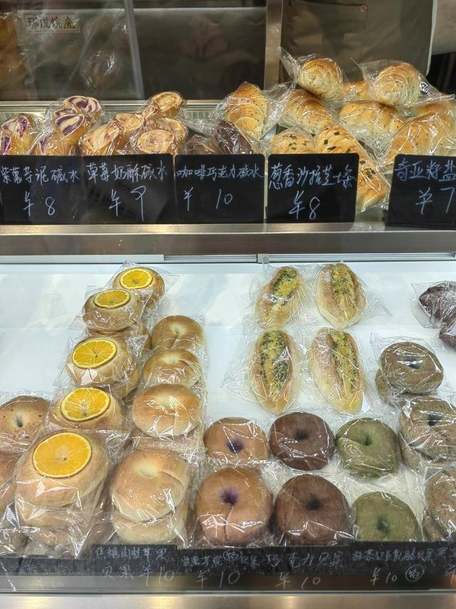 快乐加贝开在望平街附近,店面装修元气可爱,门口的巨大面包摆件很是吸睛。面包主要陈列在店门口的展示柜里,一共约有20多种可选,多为贝果、碱水等健身人士友好面包,价格基本在5-10元左右,对钱包很友好。
