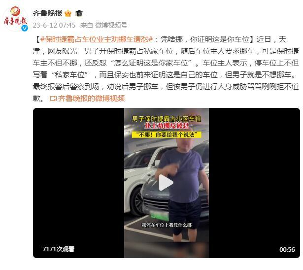 近日,天津,网友曝光一男子开保时捷霸占私家车位,随后车位主人要求挪车,可是保时捷车主不但不挪,还反怼“怎么证明这是你家车位”。车位主人表示,停车位上不但写着“私家车位”,而且保安也前来证明这是自己的车位,但男子就是不想挪车。最终报警后警察到场,劝说后男子挪车,但该男子仍进行人身威胁骂骂咧咧拒不道歉。
