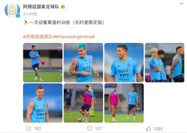 据@央视网体育,阿根廷队官方社交媒体当晚更新球队最新训练图,并配文:“收到球队在北京首次训练的照片”。