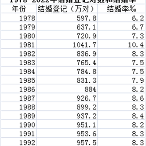 人口学专家何亚福查询了1978-2022年中国结婚登记对数和结婚率发现,2022年结婚登记对数创下1980年以来的新低。1980年结婚登记数为720.9万对。