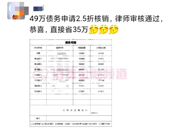 “49万债务申请2.5折核销,律师审核通过,恭喜,直接省35万。”近期,一则2.5折核销银行信用卡欠款的朋友圈引起「消费金融频道」的注意。
