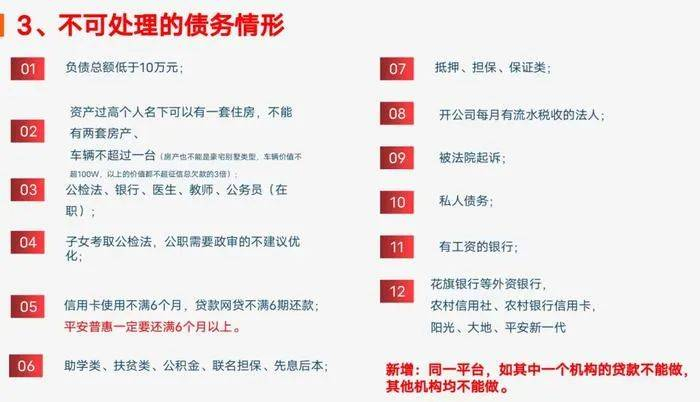 解债公司给出了12种不可处理的债务情况,包括负债低于10万;公检法、银行、医生、教师、公务员(在职);子女考取公检法、公职需要政审不建议优化;私人债务等情况均会被债务优化公司拒之门外。