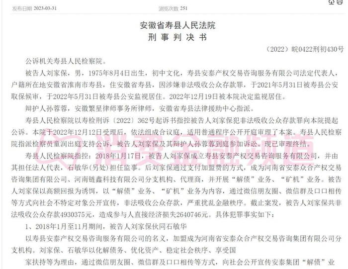 今年3月,中国裁判文书网公布了一则《刘某保非法吸收公众存款罪刑事一审刑事判决书》,根据文书,刘某保在2018年1月17日成立了一家名为寿县安泰产权交易咨询服务有限公司,并由其担任法人代表,石某华(另处)担任监事。