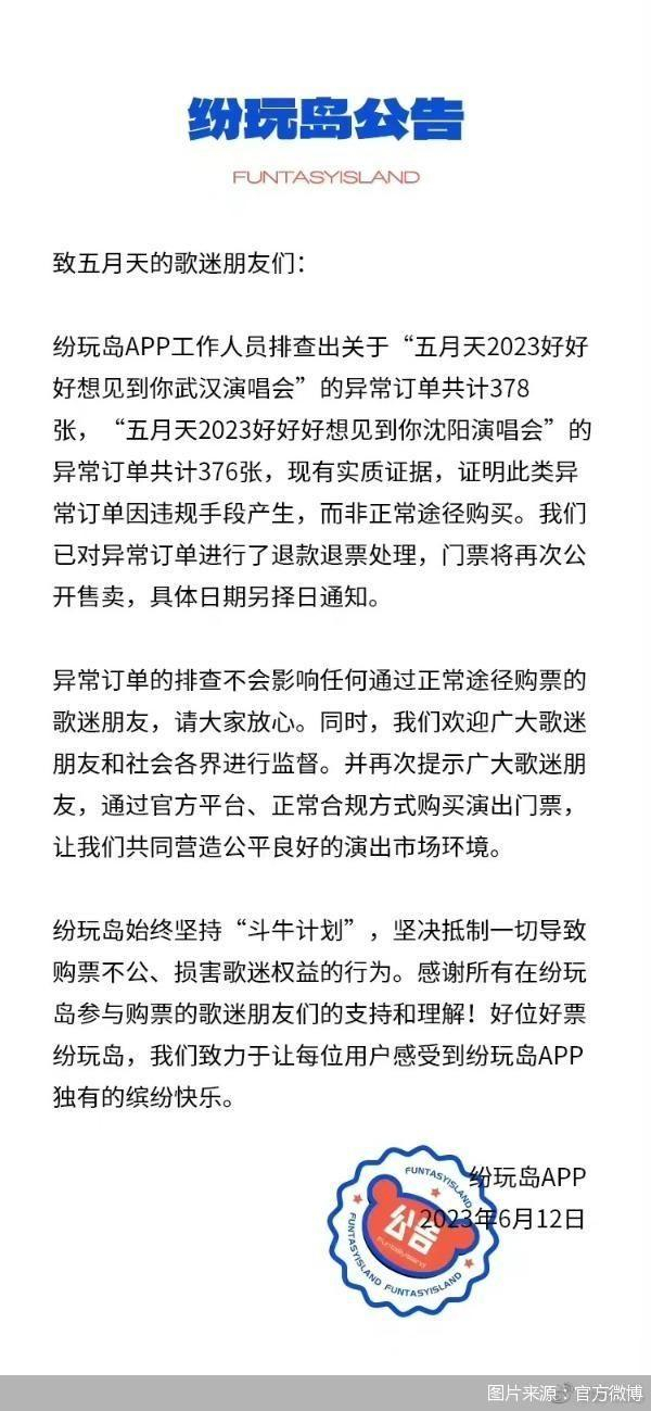 纷玩岛:对五月天演唱会异常订单进行退款退票处理