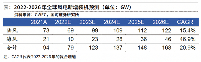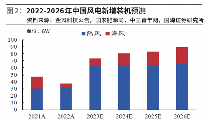 国海证券预计,2023-2026年,中国风电新增装机73.5 GW、80.6 GW、83.3GW、89.4GW,2022-2026年复合增速为24.2%。其中,陆风新增装机62.5 GW、63.6 GW、63.3 GW、65.4GW,2022-2026年复合增速为19.0%;海风方面,基于各省“十四五”海风规划,2023-2026年,中国海风新增装机分别为11 GW、17 GW、20 GW、24GW,2022-2026年复合增速达47.6%。