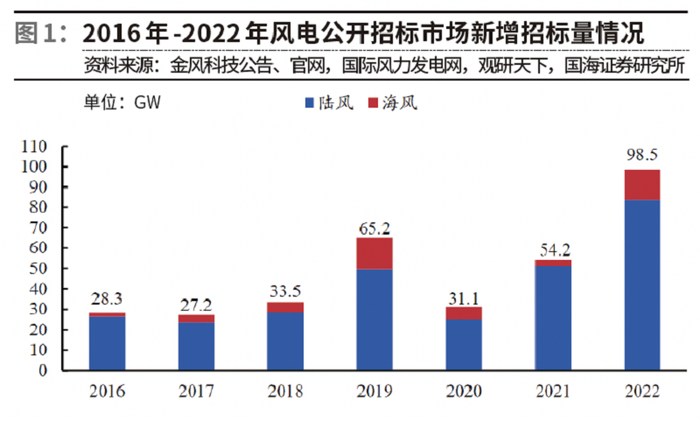 根据金风科技2022年年报,2022年,风电公开招标市场新增招标量为98.5GW,同比增长81.9%,近三年风电新增招标量总体呈上升趋势。其中,陆风新增招标量为83.8GW,同比增长63.1%;海风新增招标量为14.7GW,同比扩大4.3倍。