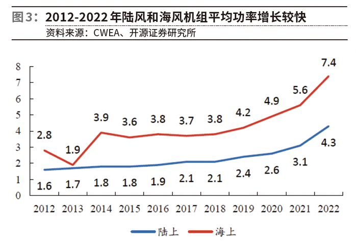 国泰君安证券认为,海风有两大趋势:风机大型化与海风深远化。中国风电已进入“大兆瓦”时代,2022年海上风电机组平均单机容量达到7420KW,同比增长33.4%,单机容量大型化有助于提升发电量、节约运维成本。