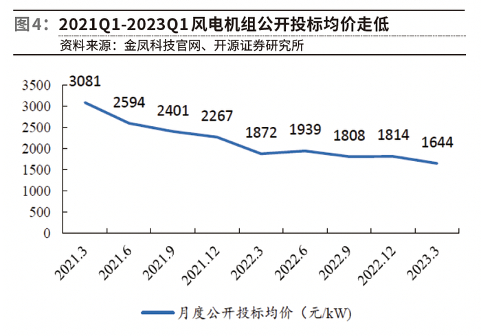 根据中银证券的不完全统计,截至2023年5月14日,本年内新增公开市场风机预中标项目中,陆上风电含塔筒项目均价为2089元/ KW,不含塔筒项目均价为1706元/ KW,相比金风科技统计的2022年12月全市场风电整机商风电机组1814元/ KW的投标均价并未出现明显波动;部分框架或集采招标项目中标均价明显偏低,但具体项目对应的风电整机招标价格仍基本持稳。