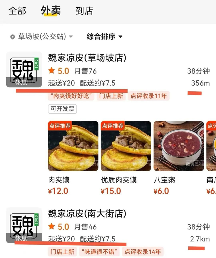 尽管西安多家魏家凉皮在美团外卖上显示“休息中”,但仍能看到,即便是三四百米的距离,配送费也约在7.5元左右,按照20元起送的价格算,配送费约占一单总价的37.5%。