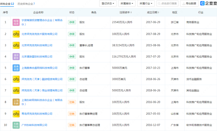《每日经济新闻》记者从企查查网站查询发现,截至6月12日,戴威名下的12家关联企业,有5家已注销,另有7家还处于存续状态,其中5家为ofo关联公司,两家非关联公司分别为宁波唯猎投资管理合伙企业(有限合伙)以及北京漫游星际科技有限公司,戴威分别持有2.124%和4.3%的股份。