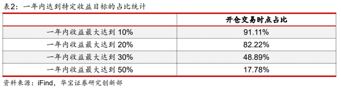 本报告进一步统计了开仓交易后的一年内,能够到达指定收益率目标的概率。对于设定投资收益目标的投资者,数据展示了投资者在根据溢价率策略交易后,一年内可以实现收益目标并止盈卖出的概率;也展示了投资者在开仓交易并获得一定涨幅后,逐渐卖出可以获得大致期望收益水平。