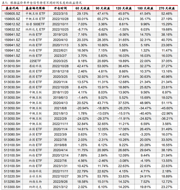 根据上述交易策略,本报告对所有QDII-ETF从2018年5月30日至2023年5月30日的溢价率数据进行了遍历,记录所有符合入场开仓时点的交易时间点,统计开仓后60、90、120、180及270个自然日所获得的收益情况;统计开仓后的一年内,出现收益率大于10%、20%、30%以及50%的概率。