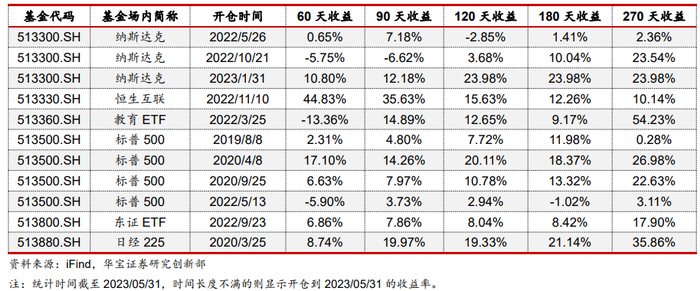 从交易时点后60天的收益来看, 45个交易时点中仅有7个会在60天后录得负收益。其中2022年10月25日开仓的159632.SZ(纳斯达克ETF)在60天时录得收益-8.71%,但是此后行情逐步攀升,最终开仓至今(2023/05/31)可以录的接近20%的收益,较好发掘了2023年以来纳斯达克持续上涨的行情;同为纳斯达克ETF的513300.SH在更接近指数底部区域的时间点出现符合开仓条件的交易信号,从而获得了更好的收益表现,开仓后至今录得超过20%的收益。(文中收益率统计均为历史回测数据,非实盘交易数据,下同)