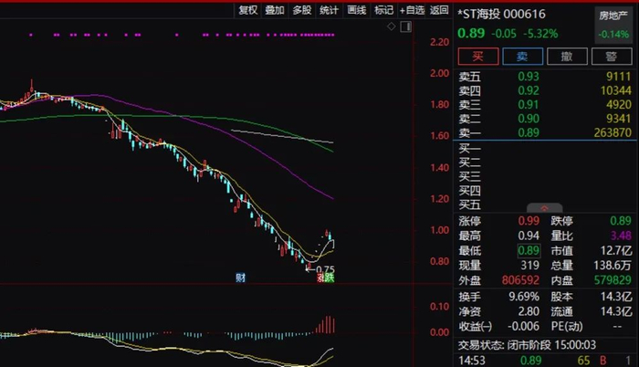 6月12日,*ST海投(000616.SZ)股价再度跌停,收盘报0.89元。