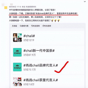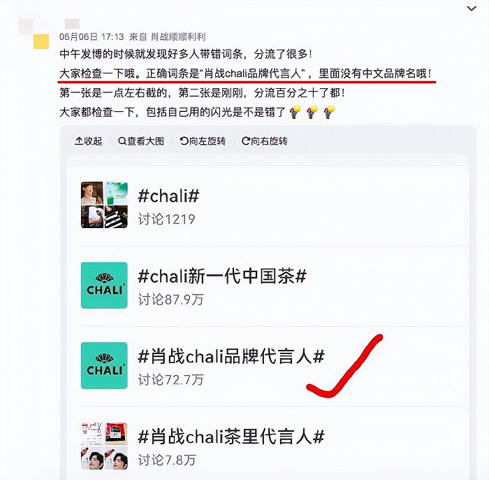不过就在当天,一位认证为肖战超话粉丝大咖的网友还曾细心的提醒网友“中午发博的时候就发现好多人带错词条,分流了很多!大家检查一下哦。正确词条是‘肖战chali品牌代言人’ ,里面没有中文品牌名哦!”