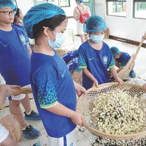 6月5日,南宁市滨湖路小学部分三年级师生来到“中国茉莉之乡”广西横州,参与茉莉花劳动研学活动。活动中,师生们走进茉莉花种植示范基地,从鲜花采摘开始,逐步体验茶花拌和窨制—堆窨—通花—收堆—起花—烘焙—冷却—转窨—提花—茶花分离等步骤,体验世界级非遗项目茉莉花茶窨制工艺的全过程。随后,大家还冲泡茉莉花茶,自制茉莉花奶茶。