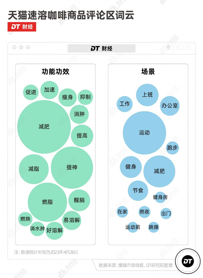 根据魔镜情报市场数据,在天猫平台速溶咖啡商品的评论区,与功效相关最高频的词不是提神,而是减肥。在喝速溶咖啡的场景中,比上班更高频的是运动。