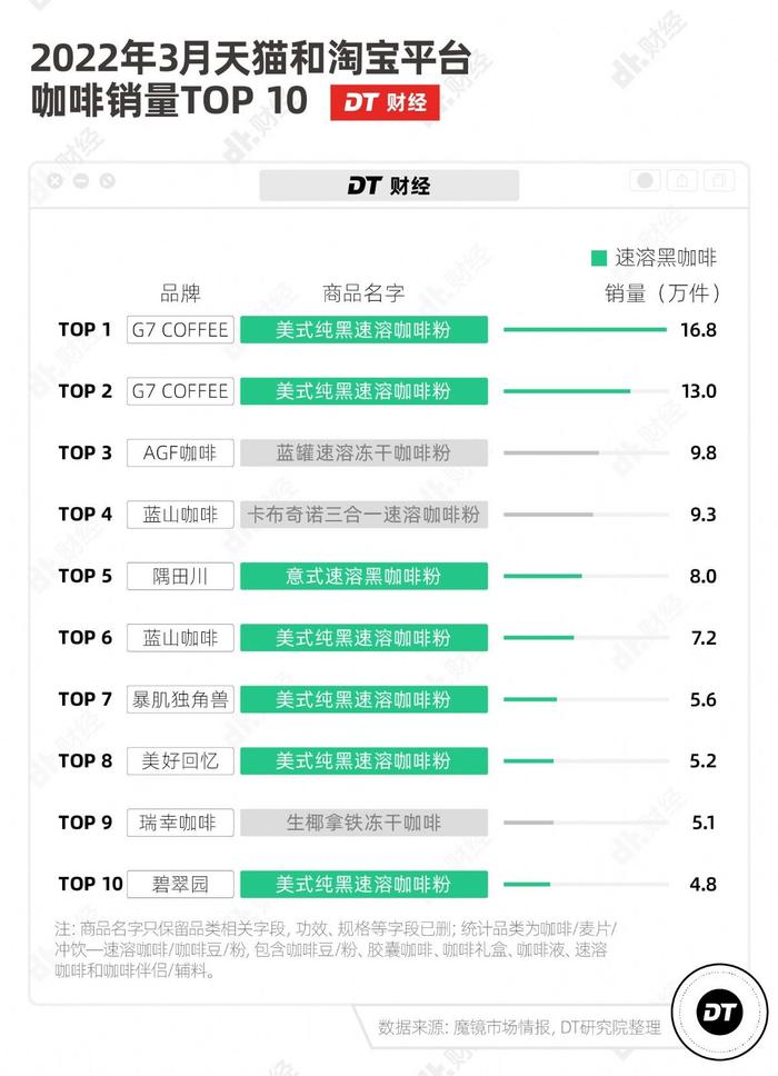 DT财经统计了淘宝、天猫和抖音上近一个月销量最高的咖啡单品,发现速溶黑咖啡在这些平台上仍是销量*。