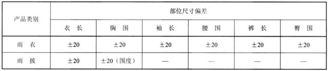 由此可见,雨衣一般指由防水布料制成的挡雨衣服。而雨披是由雨衣延伸产生的产品,通常为敞开式,没有衣袖,一般是骑车使用。标准规定,雨衣、雨披产品的尺寸偏差应符合以下要求。