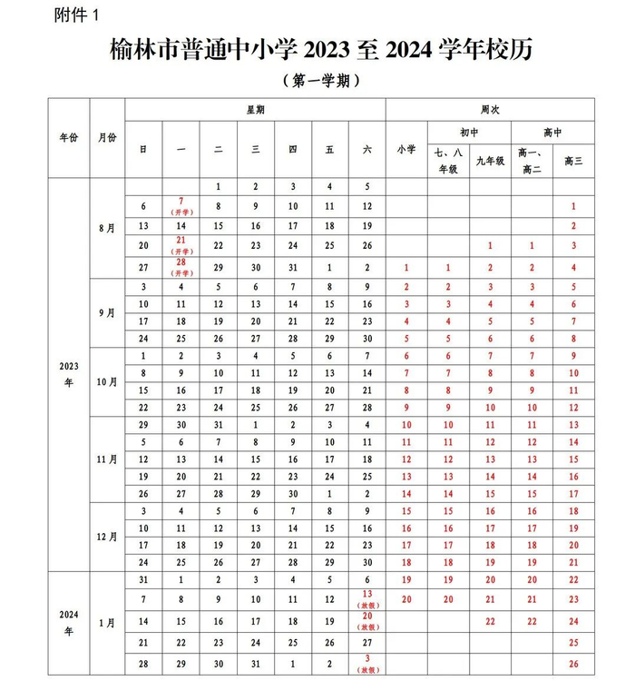 高中(普通高中、中等职业学校):高一、高二年级于2023年8月21日开学上课,2024年1月20日放假,全学期共22周。高三年级于2023年8月7日开学上课,2024年2月3日放假,全学期共26周。
