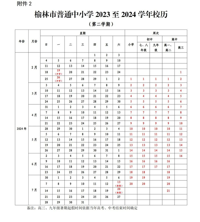 初中:七、八年级于2024年2月26日开学上课,7月13日放假,全学期共20周。九年级于2024年2月26日开学上课。