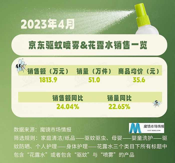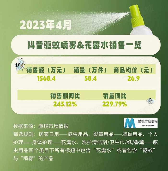 夏季将至,蚊虫活跃,驱蚊水、花露水成为家家户户不可或缺的产品。4月,魔镜市场情报数据显示,不论在淘宝天猫、京东,还是抖音平台,驱蚊水、花露水的销售额及销量与去年同期相比,均增长显著。统计期内,淘宝天猫驱蚊喷雾&花露水销售额9809.9万元,同比增长23.07%;京东平台销售额1813.9万元,同比增长24.04%;抖音平台销售额1568.4万元,同比增长243.12%。
