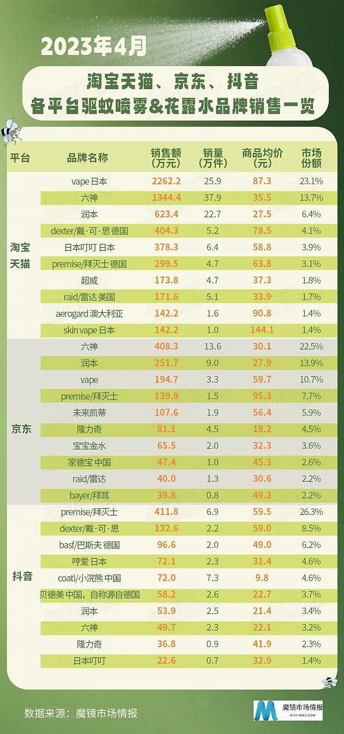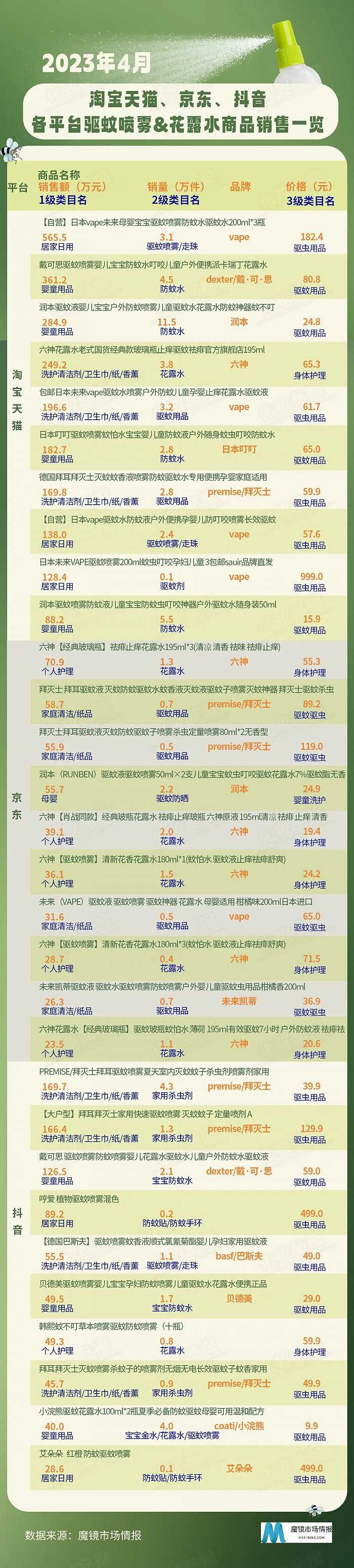 4月,日本vape未来的3瓶200ml装母婴驱蚊水以565万元的销售额成为淘宝天猫驱蚊液单品销售额第一,第二位是热卖361万元的戴可思的母婴驱蚊喷雾。而国产品牌润本的母婴驱蚊喷雾以285万元的销售额位列第三。