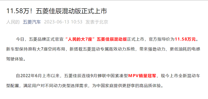 据五菱汽车6月13日消息,五菱品牌正式官宣“人民的大7座”五菱佳辰混动版正式上市,官方指导价为11.58万元,新车型保持原有大7座空间布局。自2022年6月上市以来,五菱佳辰连续9月蝉联中国紧凑型MPV销量冠军。